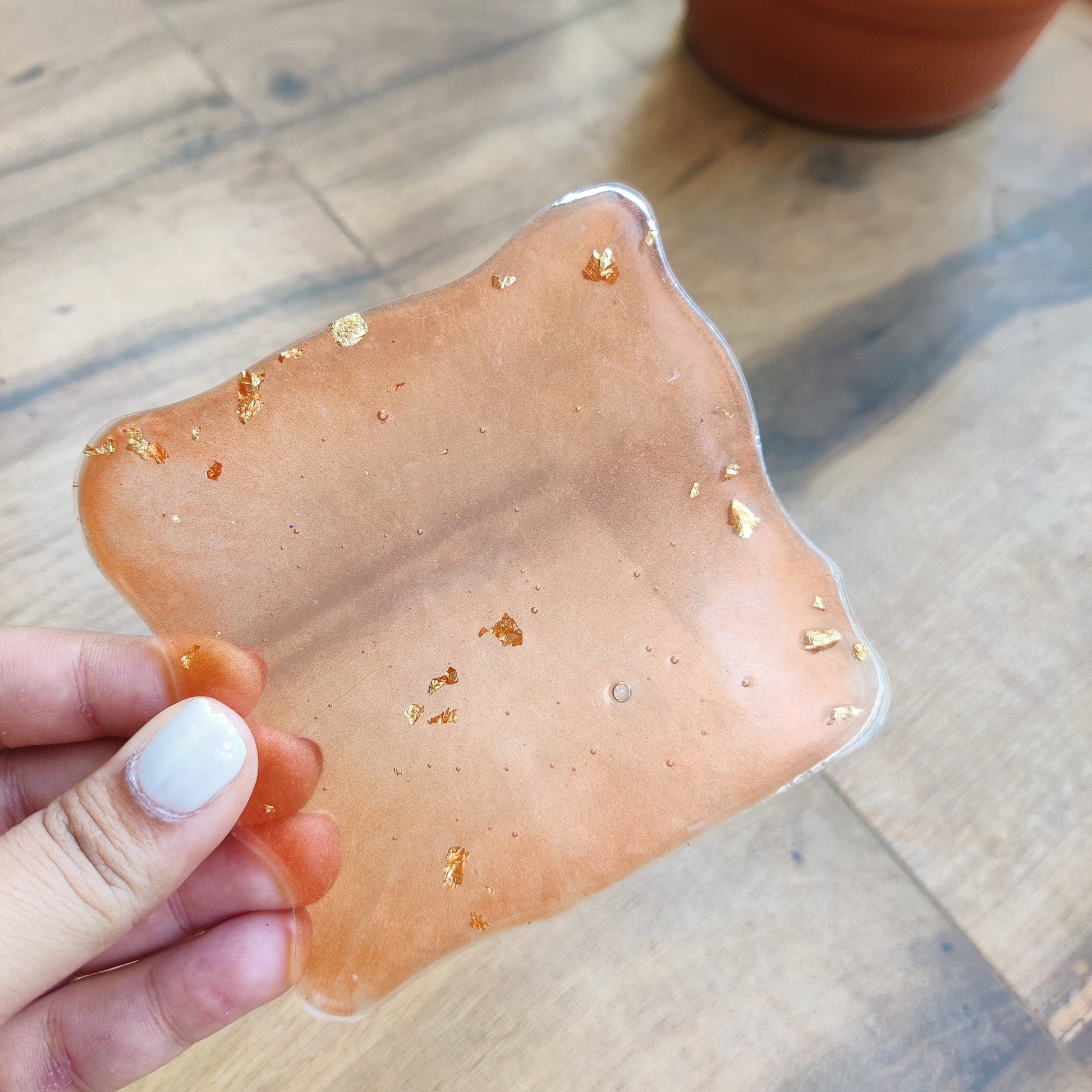 This adorable bear-shaped resin coaster is a blend of warm burnt orange tones with delicate gold foil flakes, giving it a unique and luxurious feel. The smooth, glossy finish enhances its elegance, making it a perfect decorative yet functional piece.